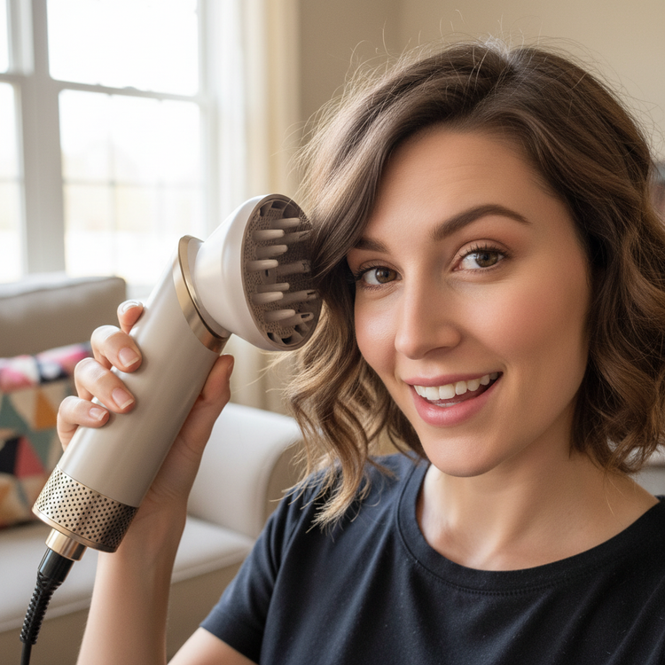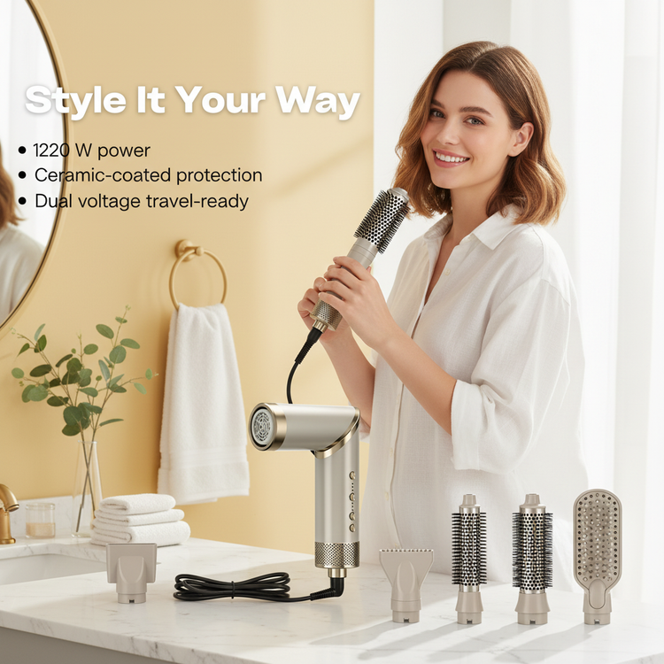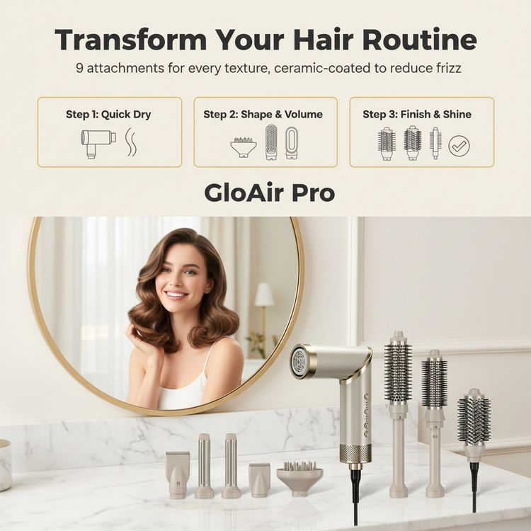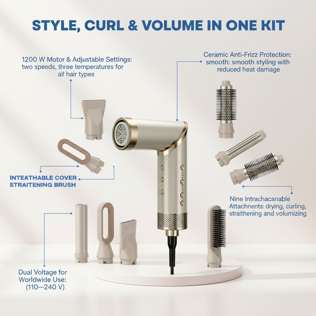 9 specialized attachments: from curling wands to straightening brushes, plus concentrator and diffuser for all hair textures. Ceramic-coated heating reduces frizz and protects your hair health.